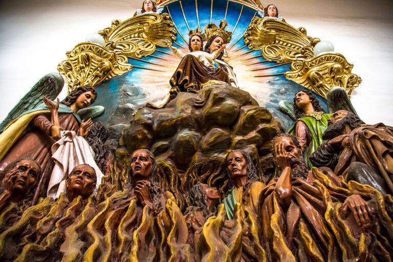 Como pequeños teatros sagrados, estas capillas son joyas dentro de joyas. Cada una guarda un santo diferente, rodeado de flores talladas, ángeles y ornamentos que parecen moverse con la luz de las velas.